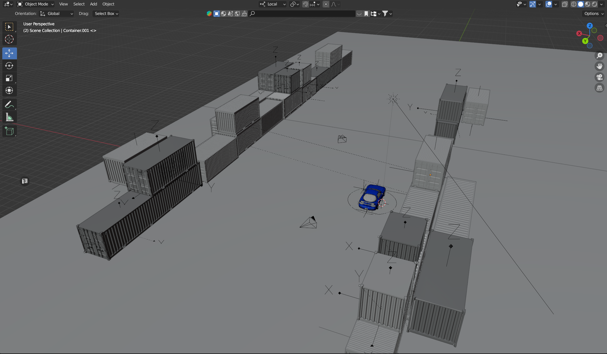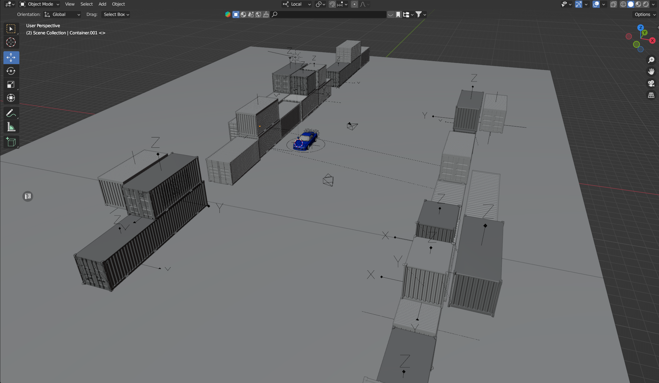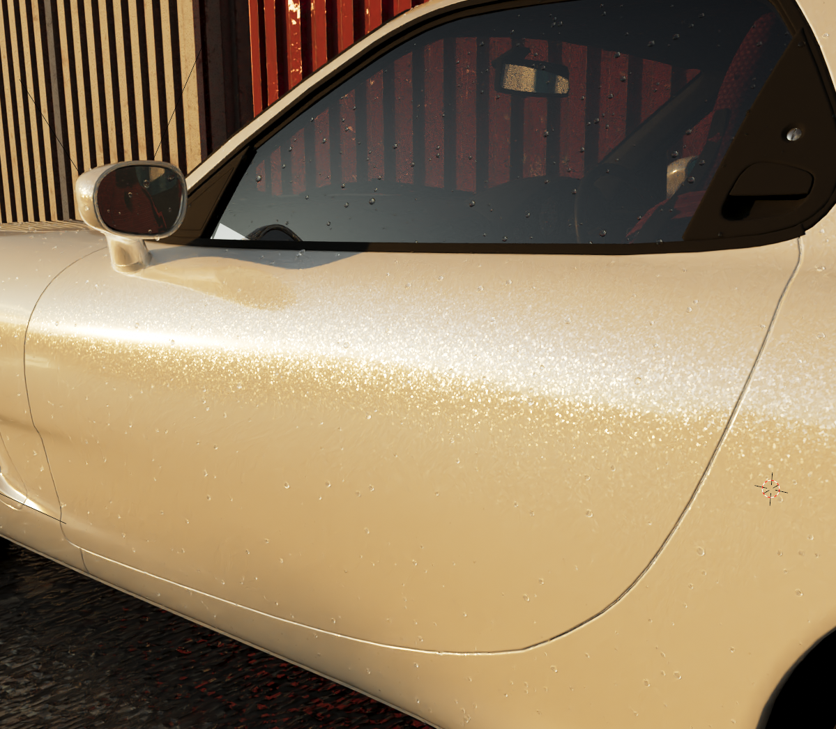 Containers model in Blender. Car’s model from previous practice. Texturing in Substance Painter. Droplets by using Geometry Nodes.